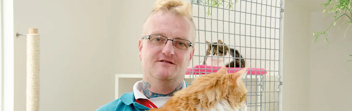 Ik heb echt wat aan hem en ik hoop dat hij hier een goede tijd heeft.” Rody: “Het is vrijwilligerswerk en niets moet. Daar kan ik niet zo goed tegen, tegen moeten. Maar hier is het gewoon erg leuk. Ik word er zelf ook ontspannen van. Dat is wel belangrijk, dat vrijwilligerswerk leuk is om te doen. Ik maak de kattenbakken schoon, verwissel kussentjes als ze wat vies worden, stofzuig en zorg voor de katten. Als ze zenuwachtig zijn, ga ik erbij zitten en laat ik ze snuffelen. Je moet ze niet gelijk aaien. Als ze willen, knuffel ik wat met ze. Dat doe ik het liefste, lekker met de katten bezig zijn.”