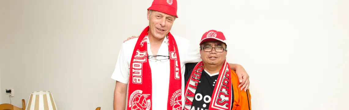 “Ik zag heel toevallig een keer ergens in een kerkblaadje een advertentie met ‘vrijwilligers gevraagd’. Die had ik uitgeknipt en na een paar maanden pakte ik hem weer eens op. Ik kende Ons Tweede Thuis al via woon- en dagcentrum Amstel-Meer. Ze vroegen voor Zijdelveld iemand die een keer per maand een biertje met iemand wilde gaan drinken. Zo ben ik zeven jaar vrijwilliger geweest voor een jongen die intussen ergens anders is gaan wonen. Een begeleider vroeg mij daarna of ik met Frank naar het voetballen zou willen gaan. Maar ik hou helemaal niet van voetballen en ook niet van grote mensenmassa’s. Wat moest ik bij het voetballen?! Maar het ging hier om een amateurclub en niet Ajax of zoiets. Wist ik veel dat Frank gek was van de IJsselmeervogels. Ik ben eerst maar eens een keer met hem naar een wedstrijd gegaan. We werden er goed ontvangen. Het beviel wel en we gaan nu voor het derde seizoen naar de thuiswedstrijden”, vertelt Willem. Frank vult aan: “Hij is zelfs fan geworden. Ik heb hem voetbalfan gemaakt. Ik was een keer bij een wedstrijd IJsselmeervogels tegen Nijkerk en was meteen verkocht voor IJsselmeervogels. Het is een goede vereniging. Ze hebben ook een G-team voor mensen met een handicap. Het eerste van IJsselmeervogels heeft een keer gespeeld tegen dat G-team en het G-team won met 1-0. Er is sfeer daar, voetbal leeft er. Ik heb daar echt het zaterdaggevoel.”